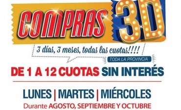 Tras la firma de un acuerdo con la Cámara de Comercio, el banco Macro y el Gobierno, se pondrá en marcha la campaña "Compras 3D" una nueva promoción de ventas en cuotas sin interés, los días lunes, martes y miércoles, durante 3 meses a partir de agosto. La adhesión de comercios cerrará hoy.