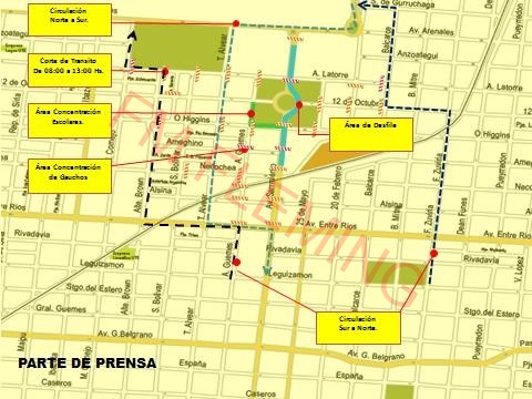 Para el desarrollo del tradicional desfile, donde participarán tropas de las fuerzas armadas, fortines de gauchos  e instituciones públicas y privadas, el personal de la repartición diagramó el corte desde las 8 hasta las 13.30, en la avenida Sarmiento, desde Arenales hasta Entre Ríos.
