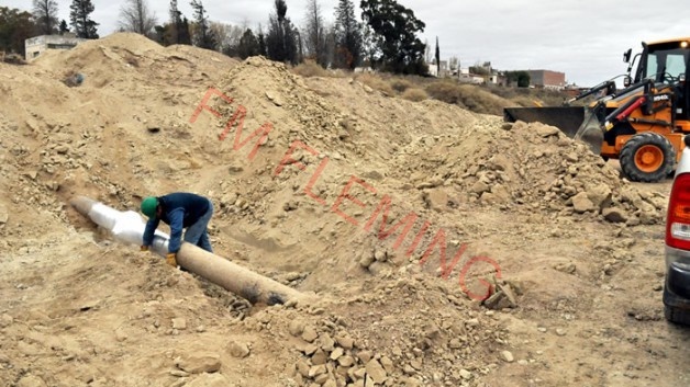 Esta primera etapa consiste solamente en la colocación de papel film sobre la abrazadera para evitar el óxido de la pieza. Luego de ello, un camión con arena cubrió el pozo y los obreros colocaron un cartel advirtiendo sobre la presencia del caño en ese lugar.