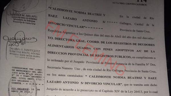 La notificación de la inscripción en el Registro Civil, del expediente que lleva la carátula “Calismonte Norma y Báez Lázaro s/Divorcio vincular” se realizó el 15 de abril. El empresario K ya se encontraba detenido en Buenos Aires y le informaron que desde entonces, estaba registrado como "divorciado".