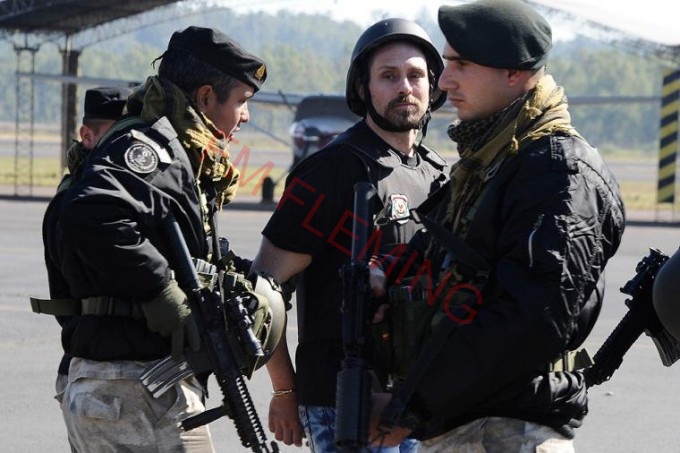 Protegido por un chaleco antibalas, casco y un pasamontañas negro, fue escoltado hasta el despacho del juez penal de Garantías 12 de la capital paraguaya, Eulogio Julián López Aquino, con quien se entrevistó alrededor de una hora, en el marco de la audiencia de extradición.