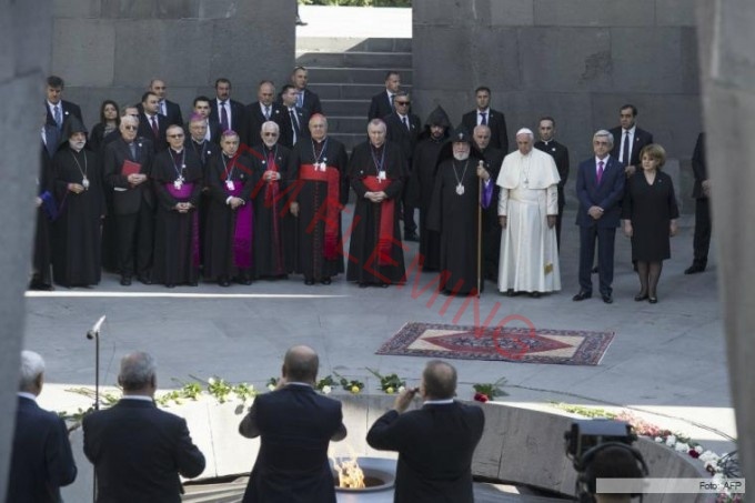 Menos de 24 horas después de haber condenado el "genocidio armenio" durante su primer día en el país, Francisco recorrió el "muro de la memoria", una construcción de 100 metros de basalto, acompañado por las autoridades locales antes de rezar frente a la llama eterna que recuerda a las víctimas de lo que el pueblo armenio recuerda como el "Metz Yegérn", el "Gran Mal".