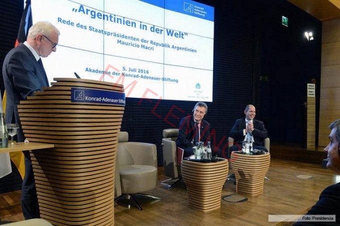 A su llegada, y a la salida de la sede de la Fundación Adenauer, el presidente fue escrachado por un grupo de militantes kirchneristas que le gritaron "corrupto" y le reclamaron que responda por los "Panamá Papers". También vivió ese episodio antes de su encuentro con la canciller alemana, Angela Merkel, quien avaló las recetas de su gobierno.