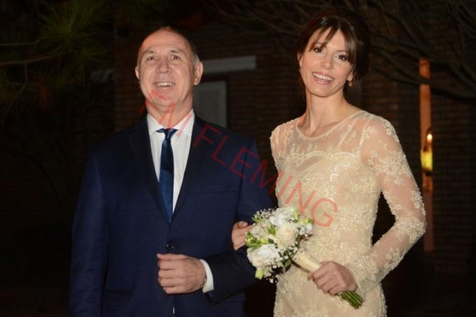 A las 19.40 salieron Lorenzetti y su flamante esposa, él con un impecable traje azul, camisa blanca y corbata del mismo tono, mientras que la esposa, con un ramo de flores blancas en la mano y ataviada con un vestido color pastel y perlado, que le llegaba hasta la mitad del muslo con una transparencia hasta las rodillas.