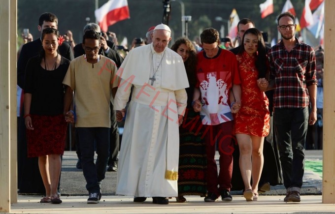 Una multitud de jóvenes alegre y variopinta recibió al ritmo de música pop al pontífice en la inmensa explanada, donde pasarán acampados toda la noche para compartir y meditar bajo las estrellas sobre fe y fraternidad.