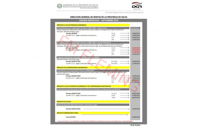 Rentas provincial, recuerda a los contribuyentes el calendario impositivo para el pago de tributos correspondientes a septiembre del año en curso. El mismo corresponde a los vencimientos del Impuesto a las Actividades Económicas, Impuesto de Cooperadoras Asistenciales e Impuesto de Sellos.