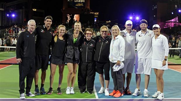 La estrella rusa, que la semana pasada obtuvo una reducción en su sanción que le permite regresar al tenis en abril, jugó en dos partidos de dobles en el evento en el Caesar's Palace en beneficio de la Fundación de Elton John contra el SIDA.