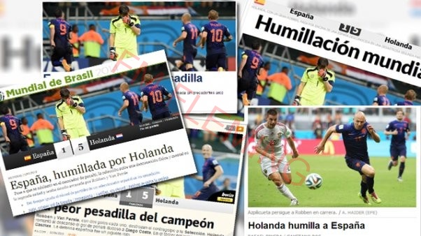 Los diarios de España fueron lapidarios con la goleada sufrida por el actual campeón del mundo en su debut en Brasil 2014. Después del calvario que debió padecer frente a Holanda, será el turno de los medios para castigar la actuación del elenco de Vicente del Bosque.   "Humillación mundial" tituló Marca, mientras que Sport anuncia en su portada que "España vive su peor pesadilla". Al movimiento se suma AS, en tanto que "El País" optó por el frío "Holanda golea a España".   Similar situación se había vivido después de la presentación española en Sudáfrica, cuando Suiza sorprendió al mundo con el triunfo por 1-0. Después de la goleada en Brasil, el cimbronazo promete ser aún más catastrófico para un campeón del mundo que será arduamente criticado por sus propios medios.