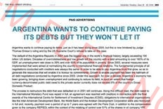 Con el título "Argentina wants to continue paying its debts buy they they won't let it" (Argentina quiere seguir pagando sus deudas pero no lo dejan), el Gobierno nacional publicó este sábado una solicitada en el diario estadounidense The Wall Street Journal, en la que deja planteada la posición del país ante el conflicto con los holdouts.