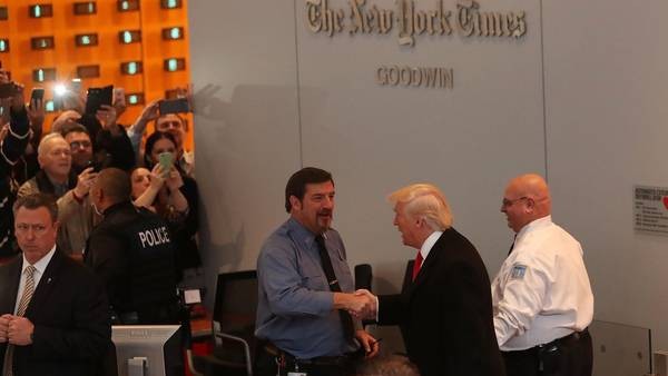 Donald Trump, presidente electo de Estados Unidos, fue al final al diario The New York Times a dar una entrevista con el medio que más lo criticó durante la campaña. Al retirarse, fue chiflado por los newyorkinos que se congregaron en el edificio, aunque otros lo apoyaron tibiamente.