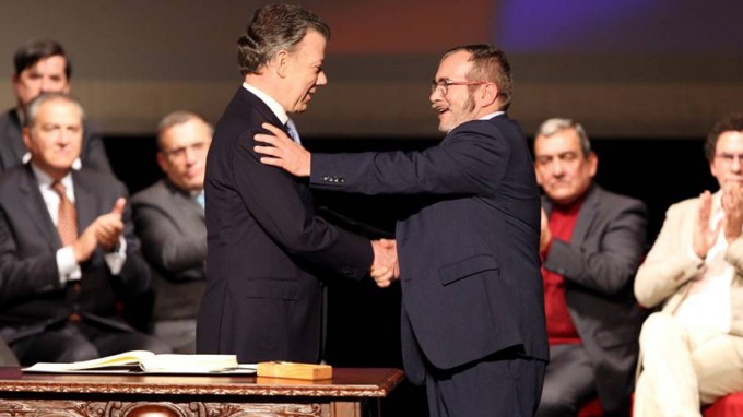 En el Teatro Colón, un emblema del centro histórico de Bogotá, se ha firmado en la mañana de este jueves el nuevo acuerdo de paz con las FARC. El presidente de Colombia, Juan Manuel Santos y el jefe de la guerrilla, Rodrigo Londoño, al que se volvieron a referir por su nombre de civil y no el alias guerrillero de Timochenko, dejaron estampadas sus firmas en lo que será el acuerdo definitivo que ponga fin a más de 50 años de guerra. El mandatario ha pedido anteponer la paz a los "intereses políticos".