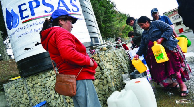 "Señora, todos necesitamos llevarnos un poco de agua. Por favor tenga consideración”, gritan molestos varios vecinos desde la larga fila ante el tanque de agua instalado ayer en Pampahasi.