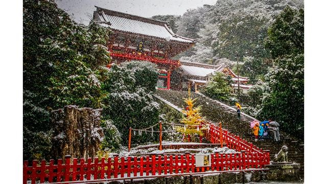 La gente camina en la nieve en el santuario de Tsurugaoka Hachimangu en Kamakura, cerca de Tokio. Foto: AP / Shizuo Kambayashi