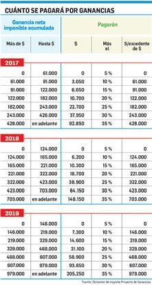 Los nuevos mínimos no imponibles de Ganancias se ubicarían unos $21.712 para los solteros y $25.231 para los casados, netos en ambos casos. De aprobarse el dictamen sin modificación de las escalas propuestas, y que coinciden con el proyecto oficial, el pago de Ganancias alcanzaría para los trabajadores casados los $242 en el caso de los que perciban unos $30.000 mensuales brutos. Sería de unos $1.940 para los sueldos de hasta $40.000; de $4.742 para los de $50.000 y de $7.842 para los salarios de hasta $60.000. En el caso de los solteros, los salarios de hasta $25.000 tributarían unos $399, mientras que los de hasta $30.000 pagarían $659. A los que perciban salarios de hasta $40.000 se les descontarían unos $2.900; mientras que hasta $50.000 unos $5.798 y hasta $60.000 unos $9.073. A estos números habrá que restarle, en la medición anual, las nuevas deducciones que introduce el dictamen de mayoría, como los $40.000 anuales por los alquileres (con un tope de $4.000 mensuales) y el cálculo de descuento por viáticos. Se mantiene el tope de $20.000 anuales por los intereses en los créditos hipotecarios y se mantiene la deducción por cónyugue. No se suman beneficios para los jubilados y se mantiene la idea oficial de un tope de 18 años por hijo.