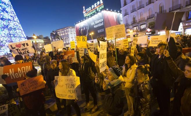 Más de un centenar de personas se han concentrado en la Puerta del Sol para protestar contra el presidente electo de los EE UU.