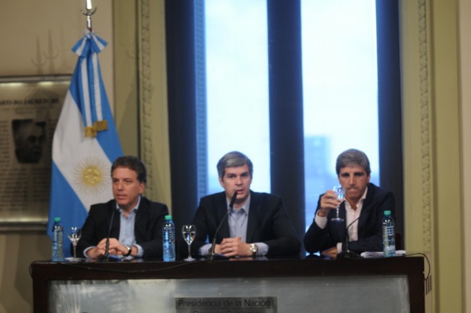 El jefe de Gabinete de Ministros, Marcos Peña, presenta a los designados ministros de Hacienda, Nicolás Dujovne, y de Finanzas, Luis Caputo, con una conferencia de prensa en la Casa Rosada.