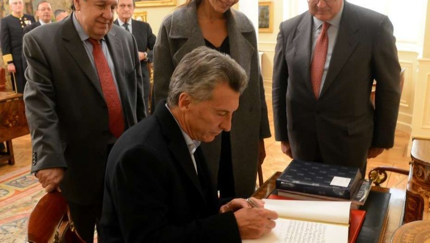 El Rey recibe a Macri en el Palacio Real y con un banquete de gala. Felipe VI será el anfitrión en la primera actividad oficial del Presidente. Habrá desfiles de tropas. Mauricio Macri firma el libro de visitas del Palacio del Pardo donde se aloja con su esposa Juliana Awada en España.