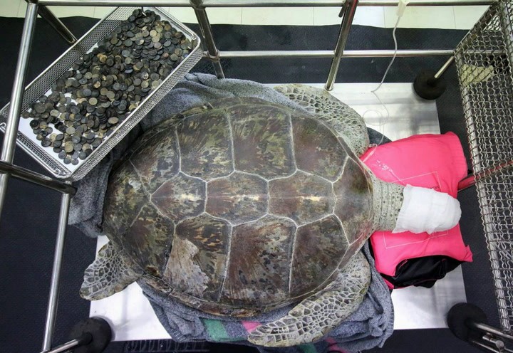Veterinarios extrajeron más de 5 kilos de monedas del estómago de una tortuga marina, que se tragó el dinero lanzado al estanque donde vivía por visitantes en busca de buena suerte.