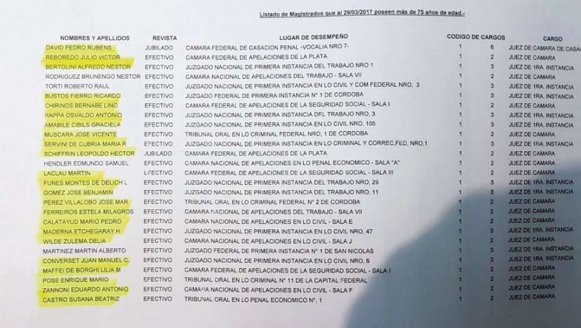 Entre ellos hay un juez de casación, David Pedro Rubens, vocal de la Cámara Federal de Casación Penal; 14 jueces de Cámara, entre ellos el juez de la Cámara de Apelaciones de La Plata Julio Reboredo o su colega en ese mismo tribunal, Leopoldo Héctor Schiffrin -protagonista de la decisión de la Corte Suprema de ayer- y 11 magistrados de primera instancia, entre los que sobresalen María Romilda Servini de Cubría -Jueza Federal de la Capital Federal- y Ricardo Bustos Fierro -Juez Federal de Córdoba-.