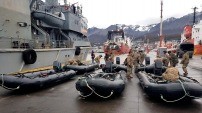 El aviso ARA Islas Malvinas, que por orden del ministro Julio Martínez había zarpado el sábado último de Ushuaia, arribará en las próximas horas, con 35 Infantes del Batallón de Infantería de Marina 4 especializados en rescate en estructuras colapsadas y equipados con diez botes neumáticos y dos vehículos todo terreno marrua 4x4.