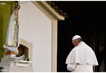 En la víspera de la celebración de los cien años de cuando la Madre de Dios bajó de los cielos, en Cova de Iría, el Obispo de Roma se detuvo en homenaje orante ante la Reina del Rosario, en la Capilla de las Apariciones.