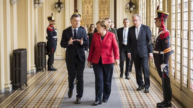 El presidente Mauricio Macri recibió este jueves a la canciller de Alemania, Angela Merkel, primero en la Casa Rosada y luego en el CCK, en una visita oficial marcada, entre otros temas, por el interés de empresas alemanas en invertir en Argentina, un avanzado acuerdo de libre comercio entre el Mercosur y la UE, la organización de las próximas cumbres del G20 - una de ellas el año próximo en Buenos Aires - y el interés mutuo sobre el cambio climático y las energías renovables.