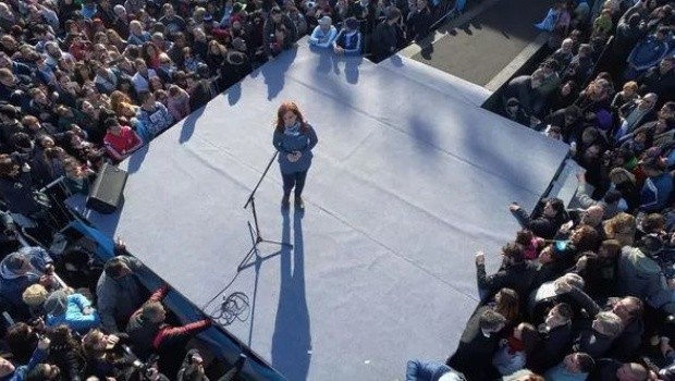 Cristina Kirchner comenzó su discurso poco después de las 15 y se mostró en el escenario rodeada de sus militantes. Los dirigentes fueron ubicados en una tribuna, siguiendo con la idea de que “los dirigentes y los partidos políticos no son importantes cuando no representan el sufrimiento de la gente”.