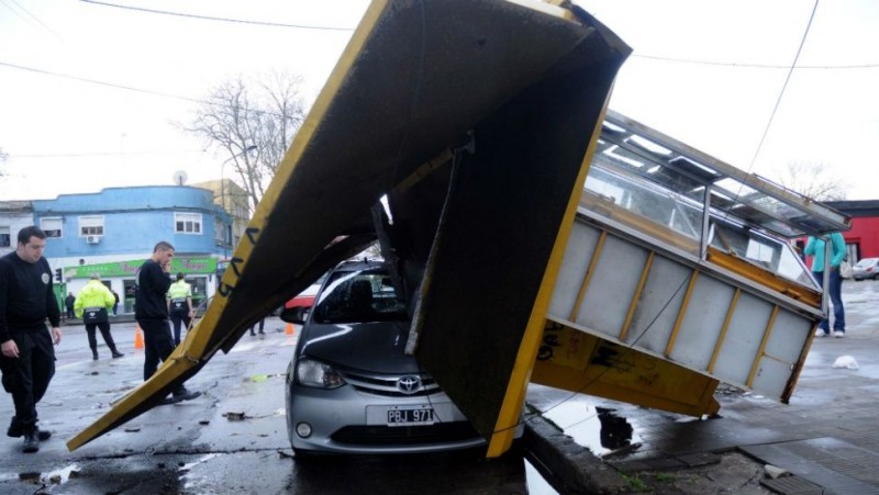 En tanto, en la intersección de las calles 41 y 22 un puesto de diarios fue arrastrado por los fuertes vientos y terminó impactando contra un automóvil que estaba estacionado a varios metros, aunque nadie resultó lesionado.