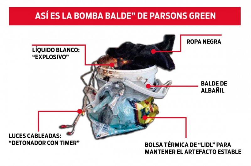 El balde bomba que provocó heridas a por lo menos 22 personas que viajaban en una formación del metro londinense presentó una falla que hizo que no estallara en su máxima capacidad.
