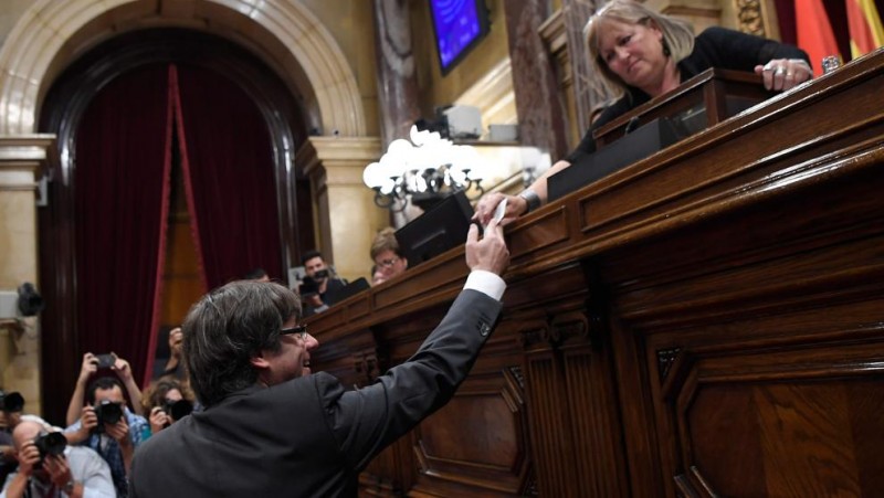 El Parlament proclama el inicio del proceso constituyente de la república catalana. La votación, con voto secreto, se produce con la ausencia de tres grupos de la oposición, Ciutadans, PSC y PP catalán. Rajoy prepara la intervención.