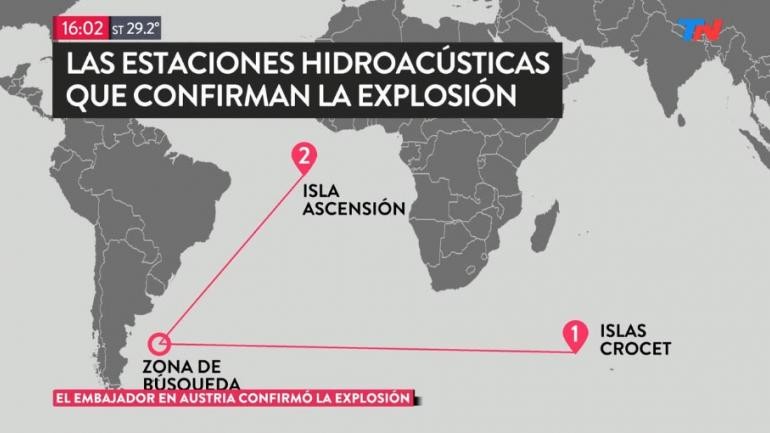 Dos estaciones hidroacústicas de la CTBTO (la HA10 ubicada en la Isla de Ascensión, y la HA4 en las Islas Crozet) detectaron "un evento impulsivo subacuático" que ocurrió a las 13.51 GMT del 15 de noviembre" en la latitud -46,12 grados y la longitud -59,69 grados, indicó ese organismo de la ONU en un comunicado.