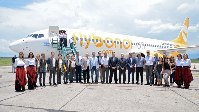 El vuelo inaugural de la aerolínea de bajo costo Flybondi se realizó ayer a bordo del avión Boeing 737-800, con la presencia del ministro de Cultura, Turismo y Deportes, Juan Manuel Lavallen y el gerente de Relaciones Laborales y de Gobierno de la empresa Flybondi, Esteban Tosutti.