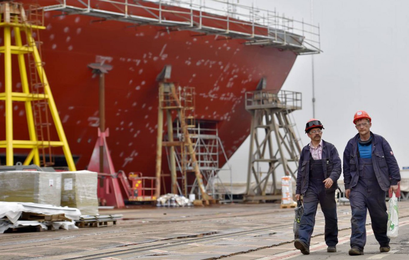 Imagen Portada:Dos trabajadores pasan al lado de una embarcación que está siendo reparada, en Saint-Nazaire