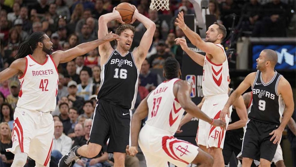 Pau Gasol y Tony Parker, en acción ante Nene, James Harden y Ryan Anderson
