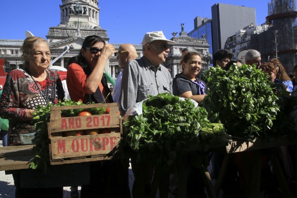 La Unión de Trabajadores de la Tierra (UTT) regalaba varios cientos de kilos de verduras este mediodía en inmediaciones del Congreso Nacional en reclamo de la ley para el acceso a la tierra propia.