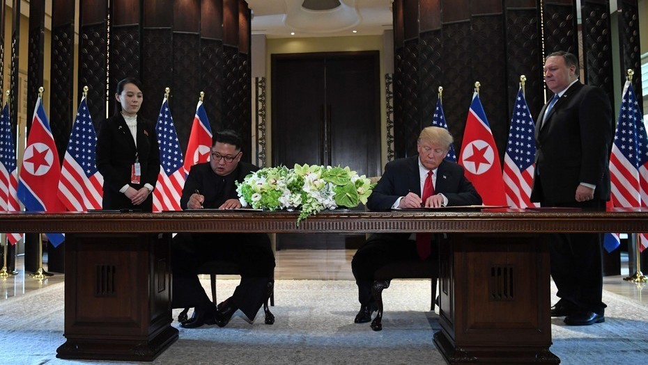 Foto Donald Trump y Kim Jong-un firman documentos, acompañados por Mike Pompeo y Kim Yo-jong. (AFP / SAUL LOEB)