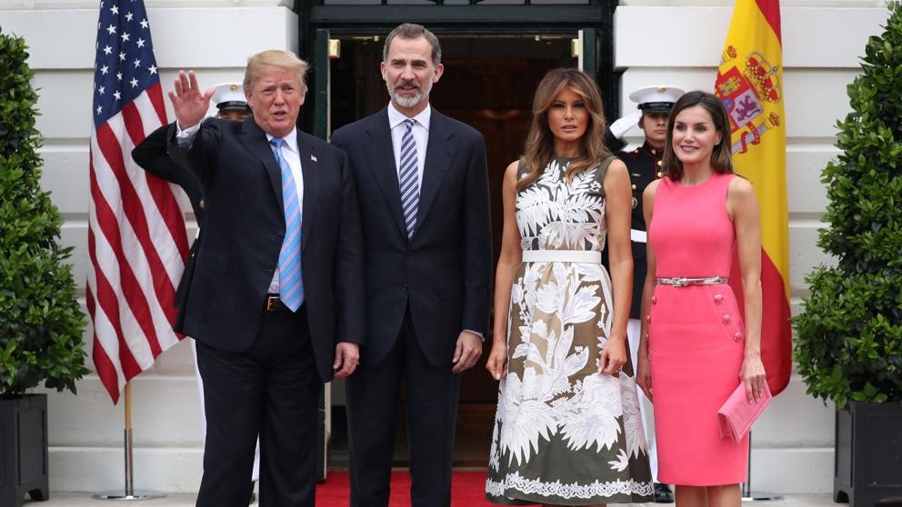 El presidente de Estados Unidos, Donald Trump, y su esposa, Melania, recibieron este martes a los Reyes de España a la entrada de la Casa Blanca para mantener un encuentro al término de la gira que Felipe VI y la reina Letizia han hecho por el país.