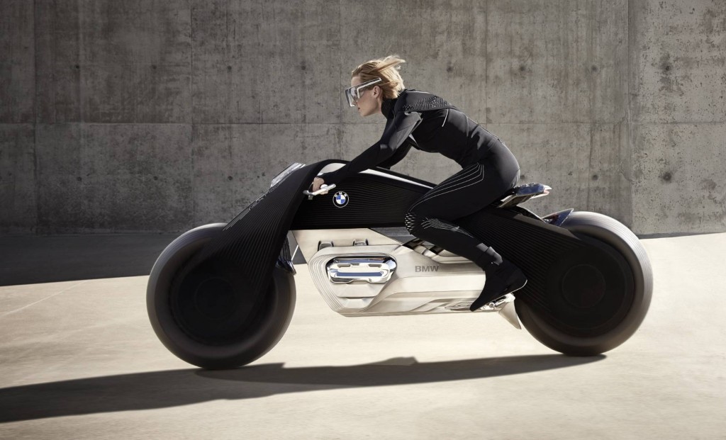 A estas alturas la idea puede parecer más un ejercicio de imaginación que un proyecto real, pero no es el único. Con motivo de su centenario, BMW presentó en 2016 la Motorrad Vision Next 100, en efecto, un verdadero juego de diseño. En un supuesto año 2116, la moto de la marca alemana, con unas ruedas enormes, monta un sistema de autobalanceo que impide que el motorista se caiga, al tiempo que se añade un traje inteligente que, entre otros detalles, modifica la temperatura o vibra para avisar de datos de navegación o peligro. Además, un sistema llamado FlexFrame permitiría doblar el bastidor para facilitar los giros.