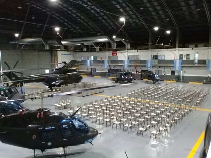 El Hangar de Aviacion de Ejército en Campo de Mayo, preparado para el acto de Macri
