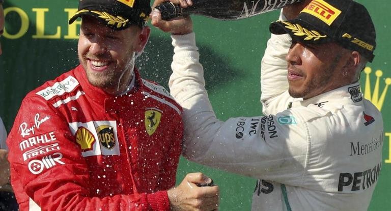 Hamilton celebra con Vettel en el podio.