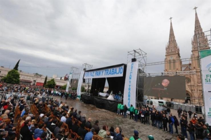 Frente a la tradicional Basílica de Luján, cuya Virgen es Patrona de la Argentina, Radrizzani fue el encargado de ponerle voz a la jornada religioso-sindical.