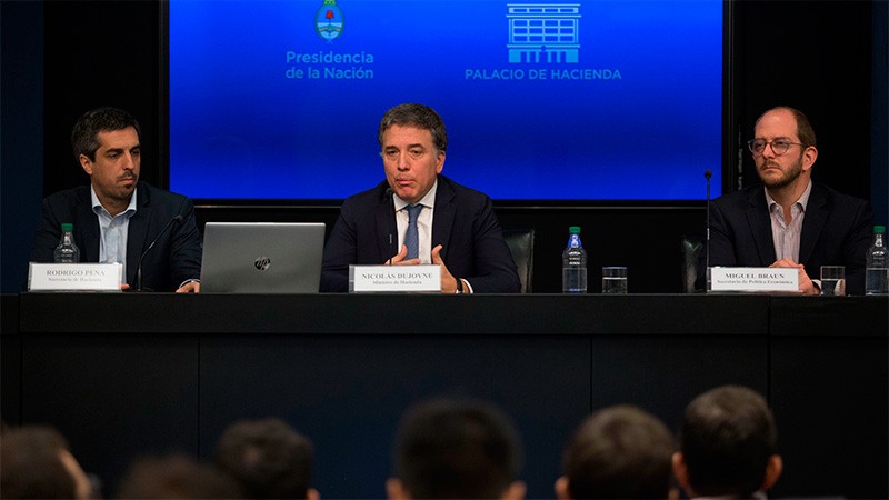 Desde el microcine del Ministerio de Hacienda, y acompañado por el secretario de Política Económica, Miguel Braun, Dujovne señaló además que en septiembre los recursos crecieron a un ritmo del 36,6% anual mientras que los gastos del Estado se expandieron 26,5%, "muy por debajo de la tasa anual de inflación del mes, cercana al 40%", dijo Dujovne.