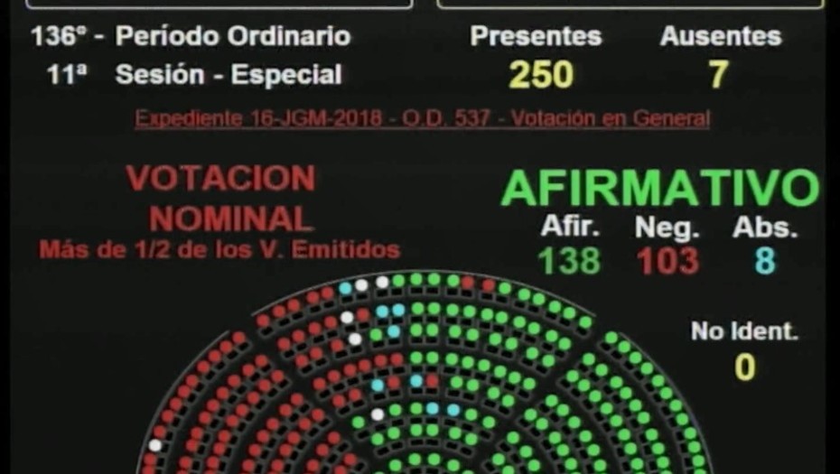 Tras una maratónica sesión la votación general contó con 160 votos afirmativos, 72 negativos y 8 abstenciones.