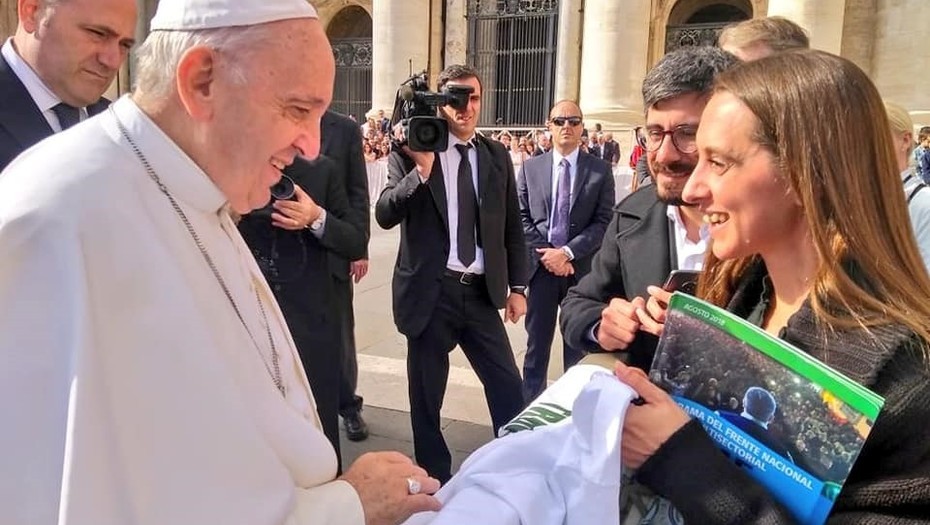 En la tradicional audiencia de los miércoles la plaza San Pedro del Vaticano, siempre llena de peregrinos que se acercan a participar de la catequesis semanal, el Papa le firmó una camiseta con la consigna del "Lujanazo" a una dirigente de la ONG La Alameda, que dirige "el amigo papal" Gustavo Vera.