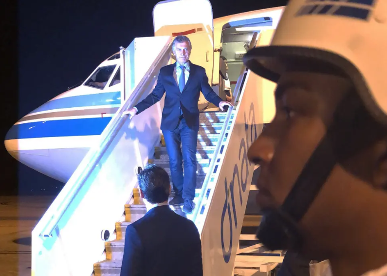 El mandatario argentino llegó a la base área de Brasilia a las 23 directamente desde Puerto Madryn a bordo del Tango 04, con cuatro de los cinco ministros que lo acompañarán. La comitiva está integrada por los ministros de Hacienda, Nicolás Dujovne; de Producción y Trabajo, Dante Sica; de Seguridad, Patricia Bullrich; de Defensa, Oscar Aguad; de Relaciones Exteriores, Jorge Faurie; y de Justicia, Germán Garavano.