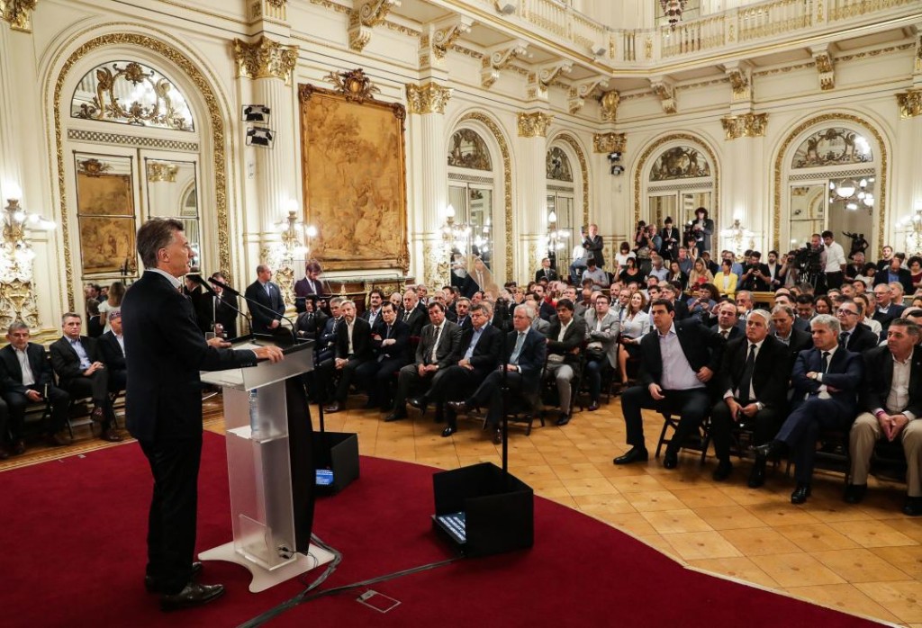 Macri hizo el anuncio en la Casa de Gobierno ante un auditorio que contó con la presencia de varios gobernadores: de Río Negro, Alberto Weretilneck, de Chaco, Domingo Peppo; de Entre Ríos, Gustavo Bordet; y de Santiago del Estero, Gerardo Zamora, entre otros.