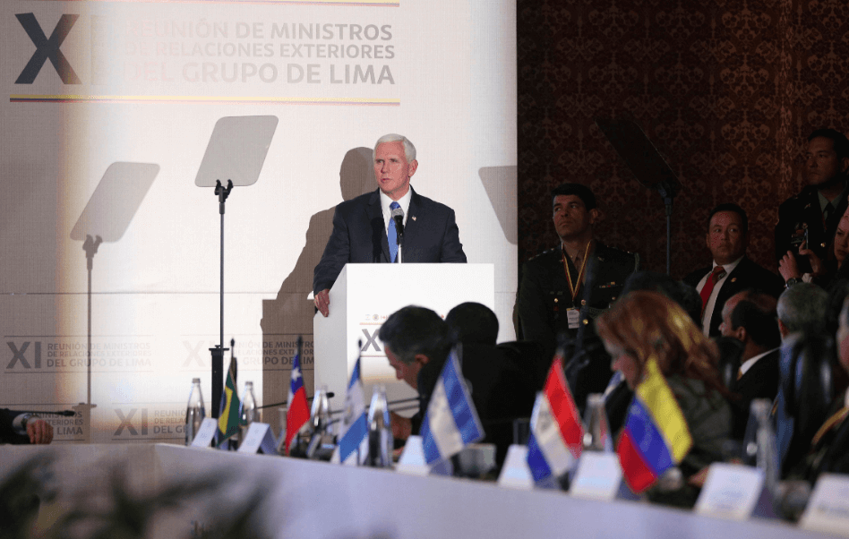 Mike Pence habla durante reunión del Grupo de Lima en Bogotá. Foto:AP