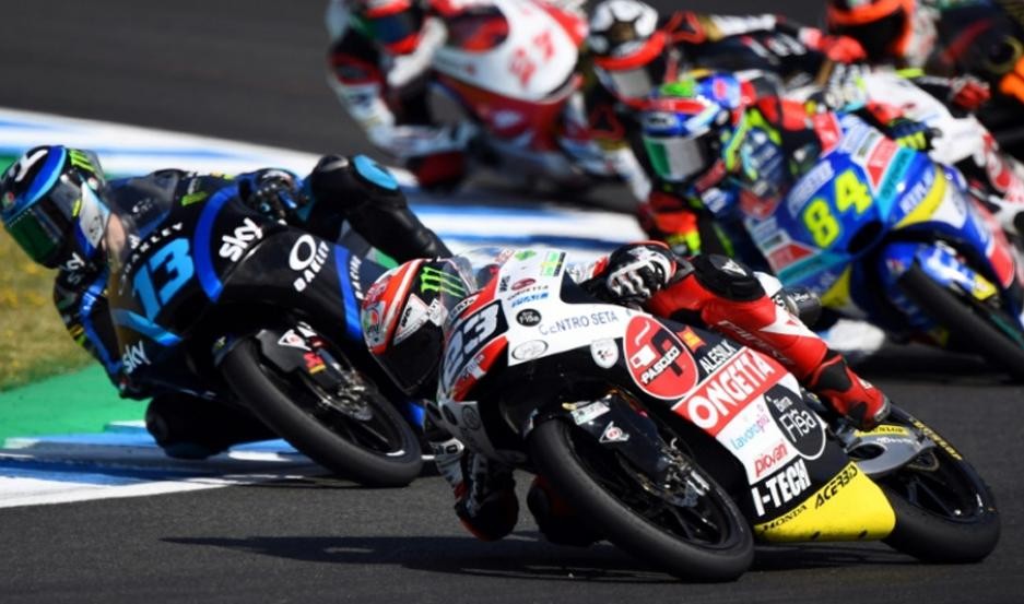 El español acompañado en el podio por su compañero de equipo japonés Tatsuki Suzuki (Honda), que fue segundo, y el italiano Celestino Vietti (KTM).