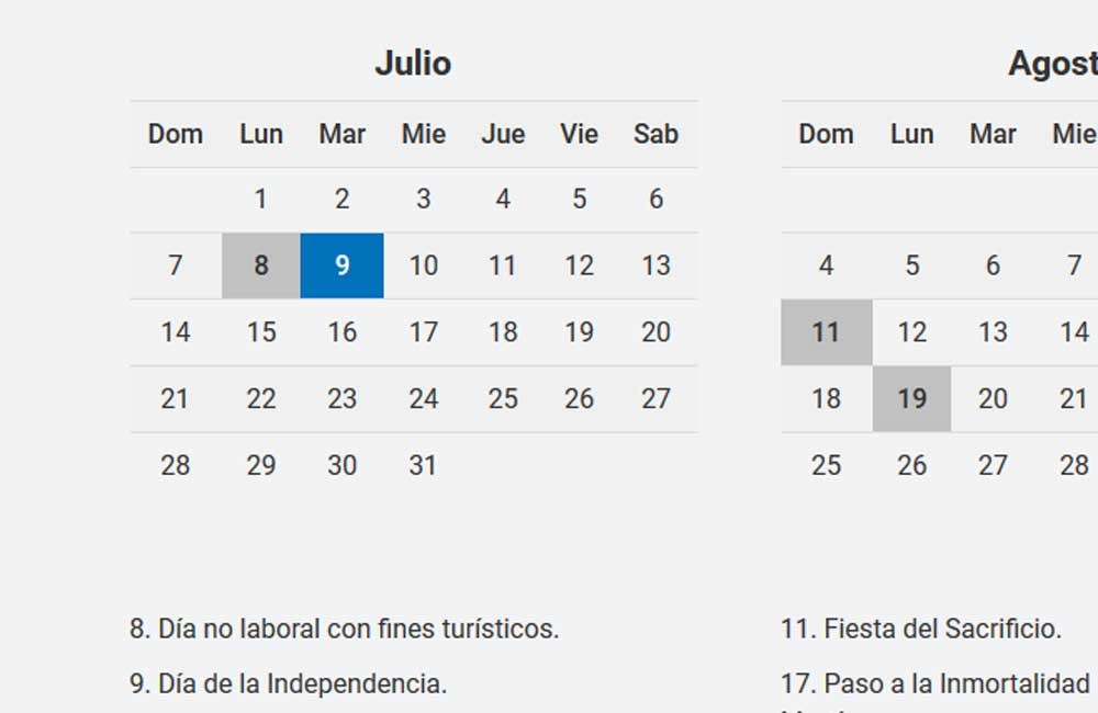 Según el calendario oficial, el próximo feriado es el martes 9 de julio por el “Día de la Independencia”. Por esa razón, se creó la confusión de si el lunes 8 era feriado puente. Sin embargo, desde el Ministerio del Interior publicaron que es día no laboral con fines turísticos.