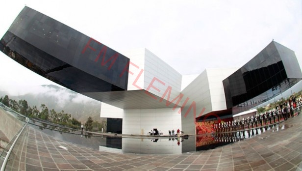El edificio, cuya construcción demandó una inversión por parte del estado ecuatoriano de 43 millones de dólares, está abrazado por amplias explanadas, espejos de agua y jardines y cuenta con tres imponentes ‘volados‘ de 50, 38 y 8 metros de longitud, que sobresalen del cuerpo central, sostenidos por un sofisticado sistema de anclajes y tensores.